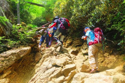 〇参加者感想文(抜粋) 感想を一言で言うと「登るスピリットを削がれた」。 理由は余りにも休憩のピッチが短くギヤをローからセコンド、サードに入れようとするとブレーキが掛かり休憩、この連続にピークまで合わせることが出来なかった。 身体は全然疲れてなかったが、朝3時半に起床、飲み屋に寄らず家に着いたのが夜中の12時は、さすがに「つかれたー」。(F.S 記) 〇担当者報告文 今回は@熱中症 A岩場の下り B中央高速道路の渋滞 が懸念されました。 @熱中症: 7月15日午前10時標高1520mの瑞牆山荘の温度が34℃を記録しました。 参加者の皆さんには登山前に水分を350cc以上摂り、ザックには1500cc以上の水を入れていただくようにお願いしました。 山行前夜に降雨があったため登山口は25℃程度で一安心でした。 途中でしつこいほど給水休憩をとり、天鳥川からの本番の登りのための体力を温存していただきました。 その結果、ギヤチェンジができなかった方には申し訳ありませんでした。 A岩場の下り: 山頂から天鳥川までの急な下りでは、岩場に掛かるクサリやロープの扱いに慣れた方が多く、班長さんのご指導で無事下山することができました。 所要時間は大幅に上回りました。標準タイムの60分を計画では80分にしましたが、実際は140分かかりました。 その結果、下山開始時刻は予定通りでしたが、登山口には1時間ほど遅れて到着しました。 B中央高速道路の渋滞: いつものことですが、往きは3時間、帰りは4時間かかりました。 深夜に帰宅された皆さん、大変お疲れ様でした。 下山口近くの駅で解散する方法を検討することも必要かと思いました。 総括: 安全に、楽しく、六つ星山の会の底力を発揮していただきました。 瑞牆山の岩壁に響いた皆さんの笑い声が私達担当者へのご褒美でした。(S.N 記) |
